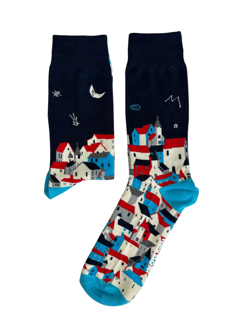 Varför bara drömma om en liten by under en stjärnklar himmel när du kan ha den på fötterna? Dessa strumpor tar dig med på en resa till en mysig by där stjärnorna lyser klart och lugnet ligger i luften. Perfekt för dig som älskar att drömma dig bort eller bara vill ha lite extra mys i vardagen.